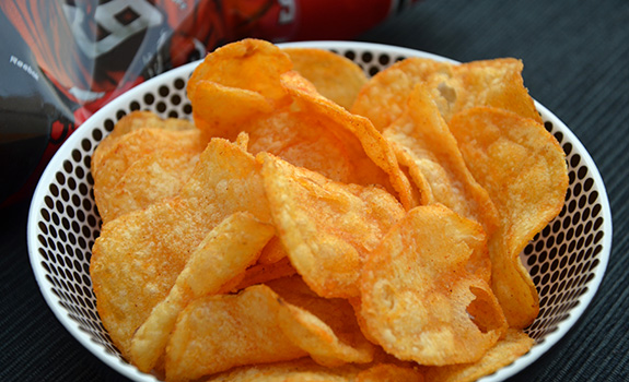 The Look: Red, white and black packaging with Cornish going for a run with the ball. The chips are large and nicely curly and well coated in seasoning.