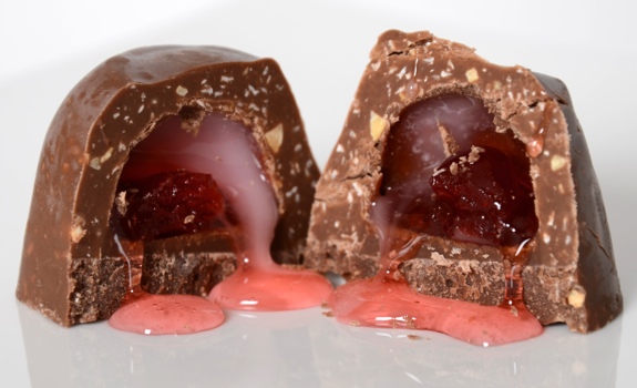 The Taste: Sweeeeeeeeeeet! Lip-puckeringly, tooth-achingly sweet, to be precise. The chocolate shell (with peanut and coconut embedded) is hard and thick, with a taste and texture not unlike a Neilson chocolate macaroon. The maraschino cherry inside is soft, sweet and lightly waxy, and the syrupy goo is in parts thick, and in other parts runny. The contrasting textures are wonderful. The cherry taste isn’t very strong, leaving the sweetness of the filling and the chocolate to dominate.